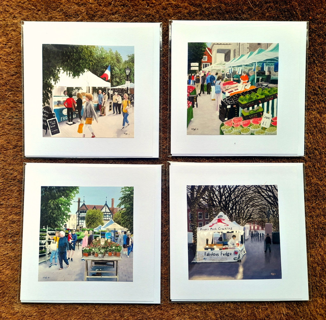 A set of four hand produced greetings cards featuring scenes from Salisbury charter market, based on my paintings. Each is blank inside and signed on the back.